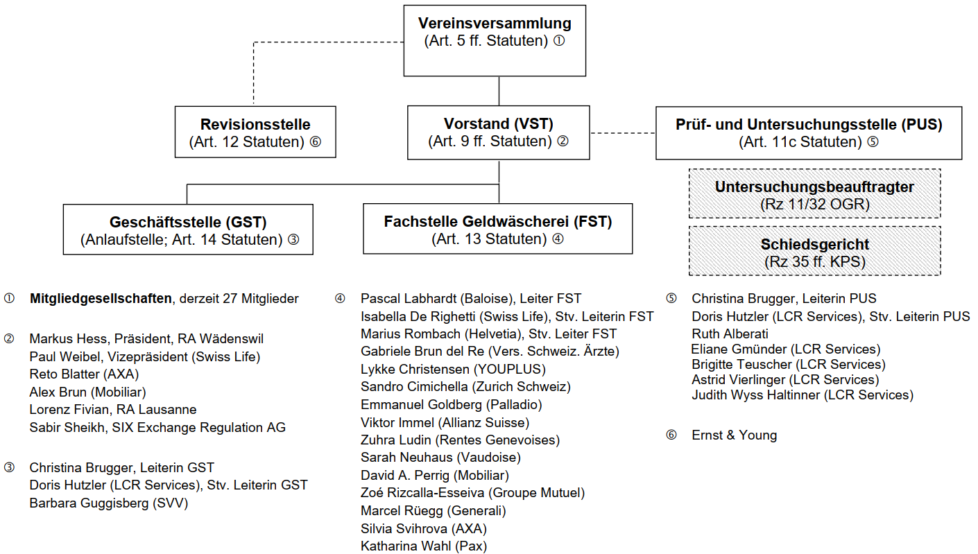 Die Organisationsstruktur der SRO-SVV ist in den Statuten festgelegt. In der Vereinsversammlung sind alle Mitgliedsgesellschaften repräsentiert und stimmberechtigt. Die Vereinsversammlung wählt auch die Revisionsstelle, welche die Jahresrechnung der SRO-SVV prüft. Die Arbeit des sechsköpfigen Vorstandes als geschäftsführendes Organ deckt ein grosses Aufgabenspektrum ab. Ihm steht mit der Fachstelle ein Milizgremium aus Geldwäschereiexperten beratend zur Seite. Eine unabhängige Prüf- und Untersuchungsstelle (PUS) führt reguläre Prüfhandlungen im Rahmen der Jahresberichterstattung wie auch weitergehende Untersuchungen im Auftrag des Vorstandes durch. Bei Bedarf können Arbeitsgruppen eingesetzt werden, die spezifische Fragestellungen in einem kleineren Expertenkreis eines Organs oder mit Vertretern der verschiedenen Organe bearbeiten. Mit der Geschäftsführung in administrativer Hinsicht ist die Geschäftsstelle, die auch ein Mitglied der PUS stellt, umfassend betraut. Alle Organe und Gremienmitglieder bilden sich laufend und ihrem Aufgabenprofil entsprechend intensiv weiter und gewährleisten einen hohen Informationsstand. Gegen Sanktionsentscheide des Vorstandes steht den betroffenen Mitgliedsgesellschaften der Rechtsweg offen. Die Anrufung eines Schiedsgerichts ist im Kontroll-, Prüf- und Sanktionsreglement (KPS) geregelt.